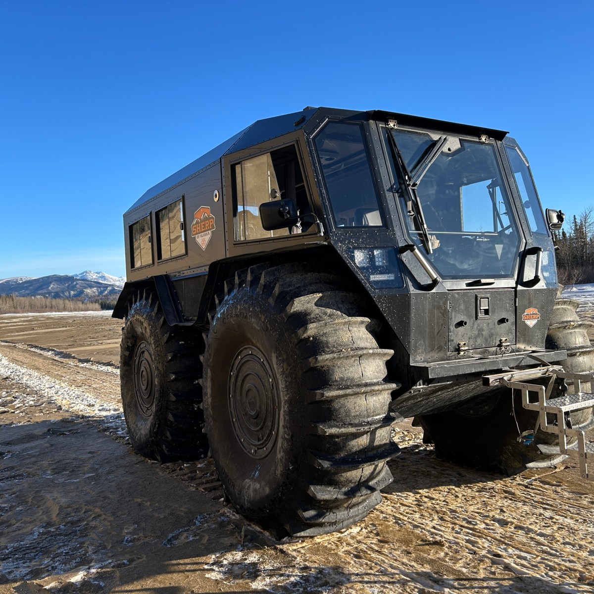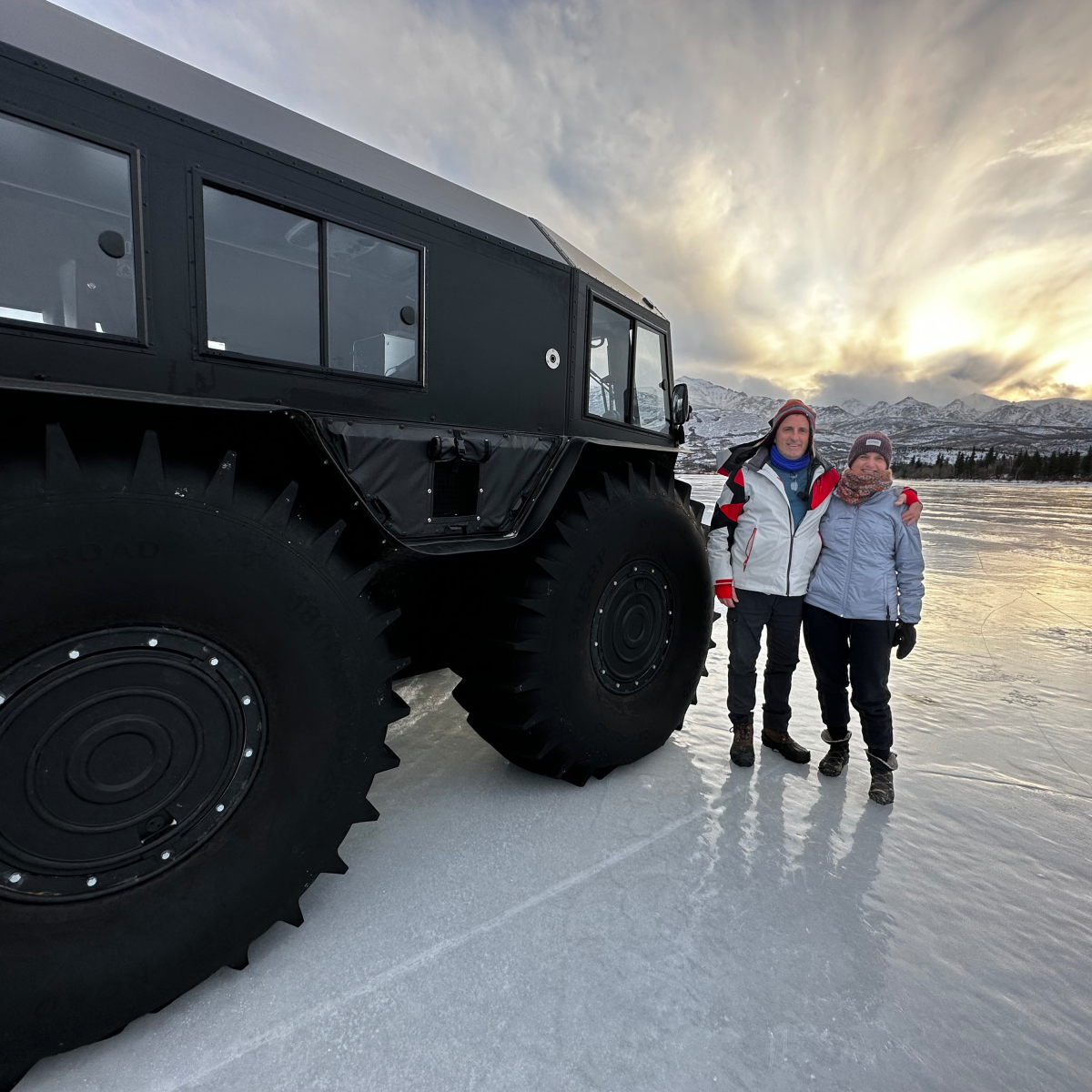 Although these vehicles often get mis-labeled as “Monster Trucks”, they are some of the most environmentally friendly vehicles off-road. The large tires help spread out our weight so they have less pressure on the ground causing less disturbance. These are the only vehicles with certifications that allow for travel across the sensitive arctic tundra in the summer time in both the USA and Canada. Low pressure tires have mechanical and efficiency advantages compared to tracked vehicles, while gaining all the advantages tracks offer when we deflate the tires. The vehicles have economical small diesel engines that burn about 1.2 gallon per hour of operation (which is more efficient than most highway vehicles). The air system uses exhaust gasses to inflate the large tires giving you unlimited air for air pressure changes to the tires while on the go.